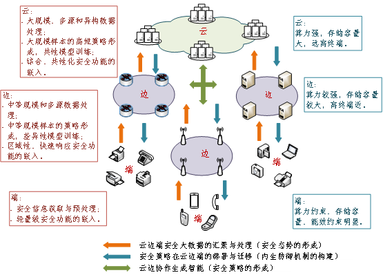 在云边端的体系架构下,研究如何建立起基于多角色属性的智能框架,并在此框架下设计协作机制来约束和规范网络实体的学习过程和行为,从而形成自主安全的防护策略。具体包括:①边缘安全策略形成机制;②云端安全策略形成机制;③云边协作的安全策略形成机制。