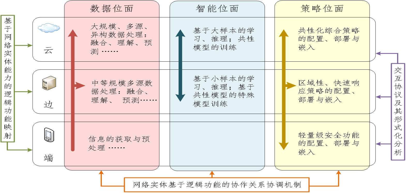 本项目将根据泛在网络空间的特征开展内生安全机制的研究。主要在云边端协作架构的基础上,研究“云边端大数据处理(安全态势的形成)”→“云边协作生成智能(安全策略的形成)”→“策略在云边端的部署与迁移(内生防御机制的构建)”的完整过程,具体包括了如下四个方面: