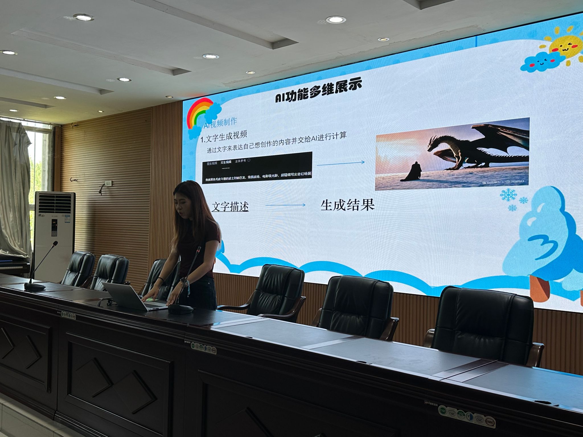在AI多功能展示环节,朱文榕通过课件详细演示了AI视频制作流程,展示如何通过文字指令,让AI完成视频创作。学生们紧盯屏幕,眼神中满是对AI创作奥秘的好奇,不放过主讲人演示的任何一个重点操作。