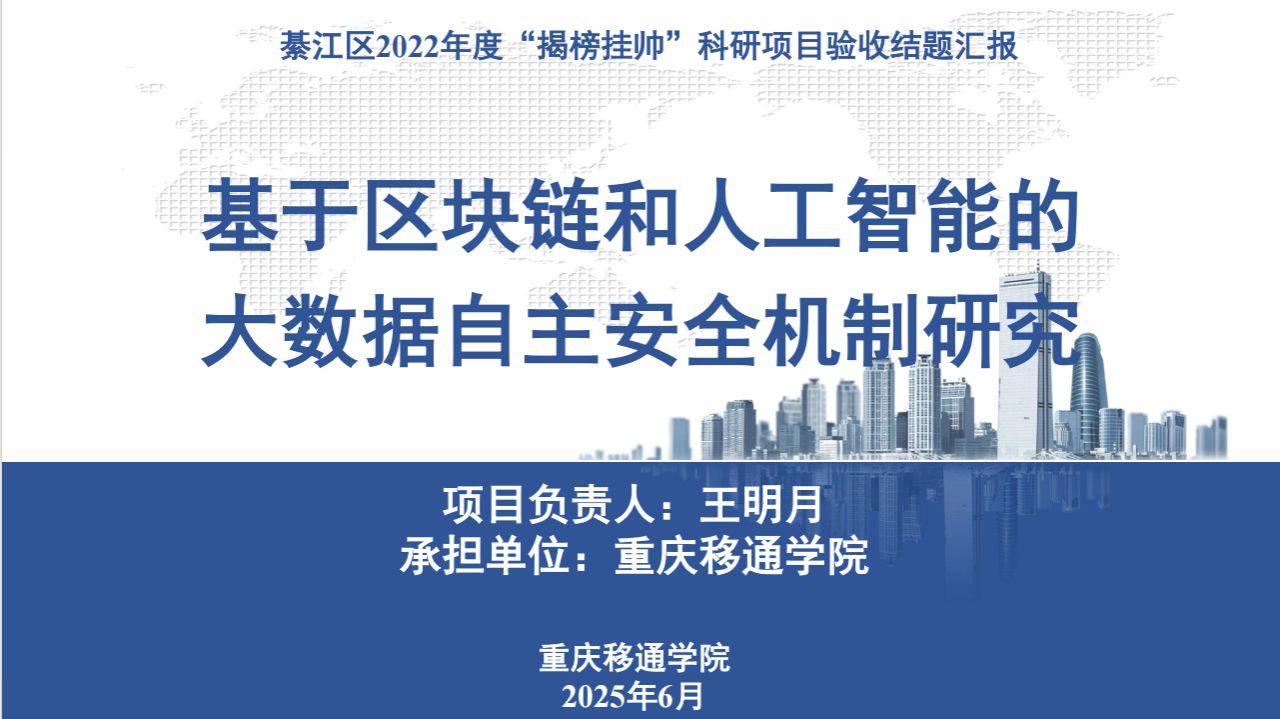 6月25日上午,由重点实验室专职科研人员王明月副教授担任项目负责人的綦江区2022年度“揭榜挂帅”科研项目——“基于区块链和人工智能的大数据自主安全机制研究”项目结题鉴定会,在重点实验室210会议室顺利举行。本次结题鉴定会采用线下汇报形式,綦江区科技局副局长陈推陈亲临指导,重庆邮电大学正高级工程师林峰、重庆首讯科技股份有限公司副高级工程师汪浩、重庆海塑建材有限公司正高工业设计师郭召忠等行业专家组成评审组,重点实验室主任李方伟教授及大数据安全研究室全体成员共同参与。